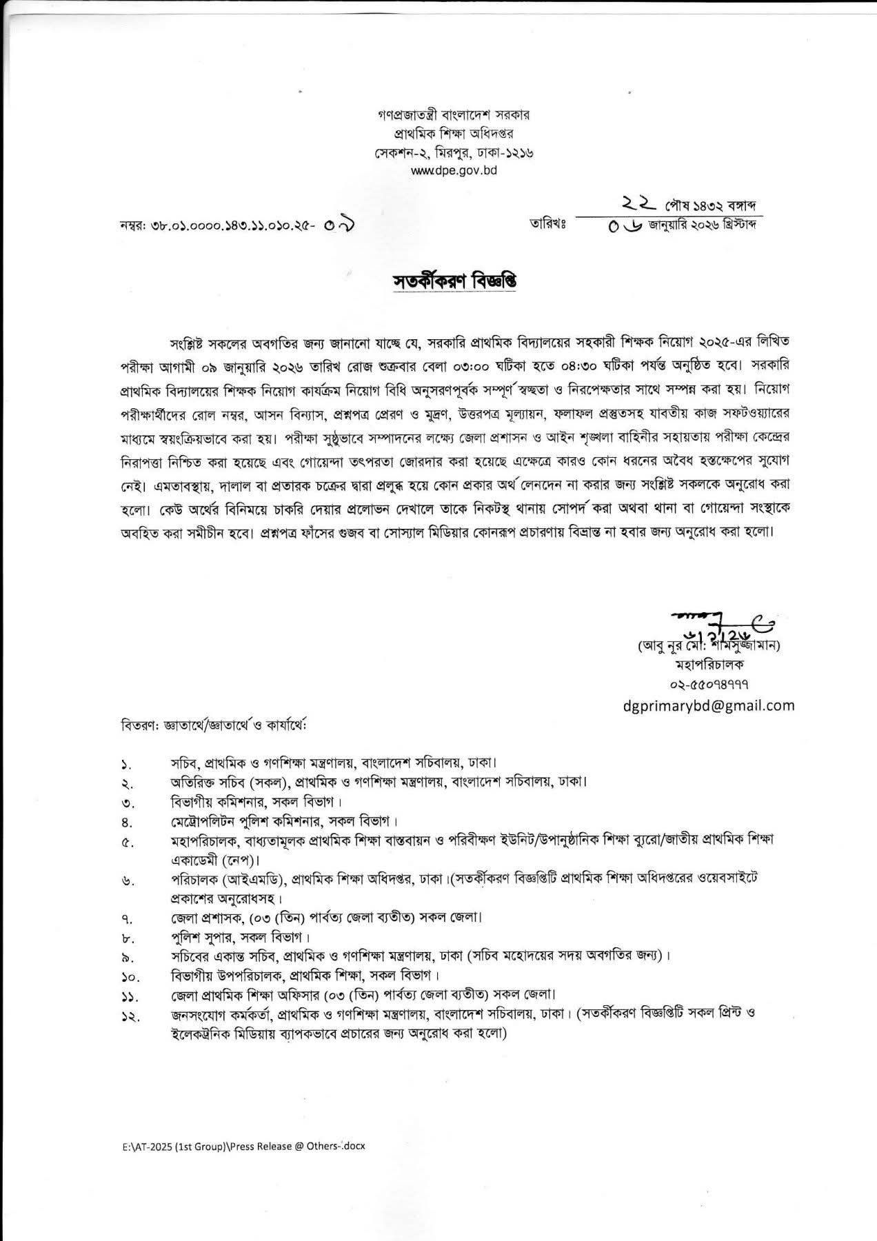 অধিদপ্তরের বিশেষ সতর্কতা: